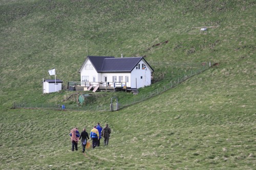 “On the island is a large fishing house owned by the Ellidagrim Islands Society, which engages in puffin egg hunting in summer and in spring. In earlier times there was a hunting lodge called simply “dwelling.” The first building which was built on the island still stands. It is used for storage, and is west of the ‘Skápana.’[1] In 1953, a new lodge was built at the foot of Hábarð (the highest peak on Elliðaey) because the old building failed the test of time. In 1985, work began on a new two-story fishing house which was attached to the house that was built in 1953; it was completed in 1987. In 1994 it was discovered that the 1953 edifice had deteriorated to such an extent that it was no longer useable. It was therefore demolished and another house built instead in the same location, with construction being completed in 1996. Between 2000-2001, a small house west of the lodge was built, which houses the Ellidagrim Islands Society sauna.”