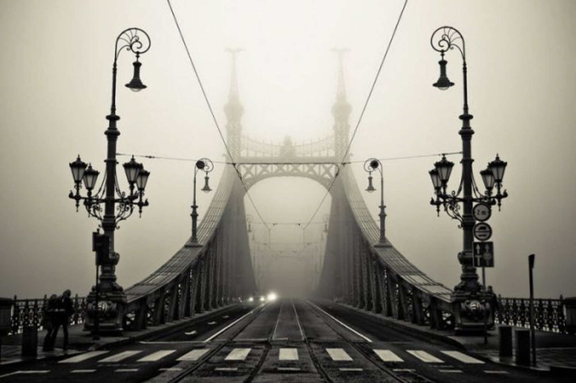 The Liberty Bridge in Budapest, seen in the mist.