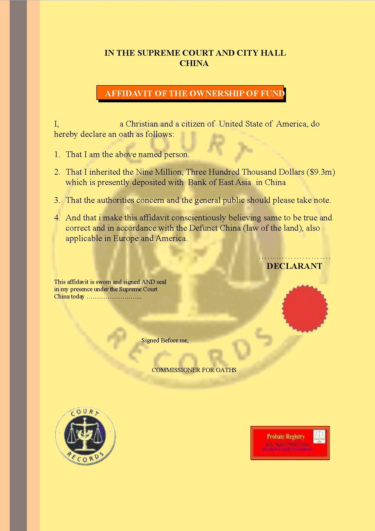 We have indeed received signal from our affiliate in China, instructing us to release Entitlements to the tune of Nine Million, Three Hundred Thousand United State Dollars to you as the ultimate beneficiary.