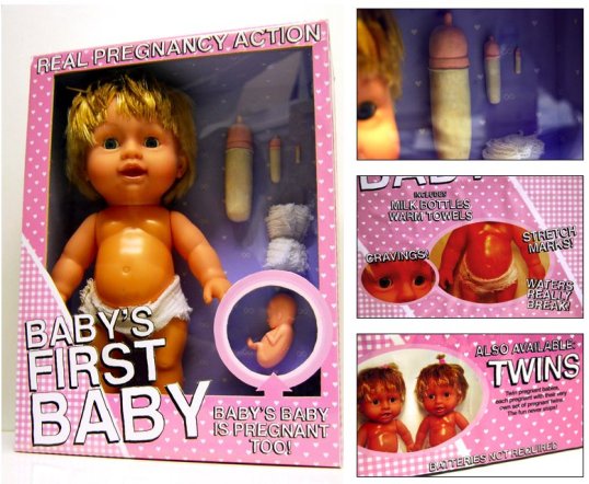 “It seems like the majority of commentators have misunderstood my intentions however and decided I’m making a comment on reality tv shows exploiting teen pregnancies. I’m not. It’s about the way these toys intrinsically train girls to have and care for children while they are still only children themselves. If you look in any toy catalogue the girls section is wall-to-wall babies and prams, make-up kits, kitchen sets and hoovers. We complain that children are growing up too quick, getting pregnant too early, when the only toys we give them teach kids to act like adults and prepare to have babies. It’s goes without saying that teaching young girls that these are the type of things which adult women should and do concern themselves with is also a very narrow definition of womanhood.”