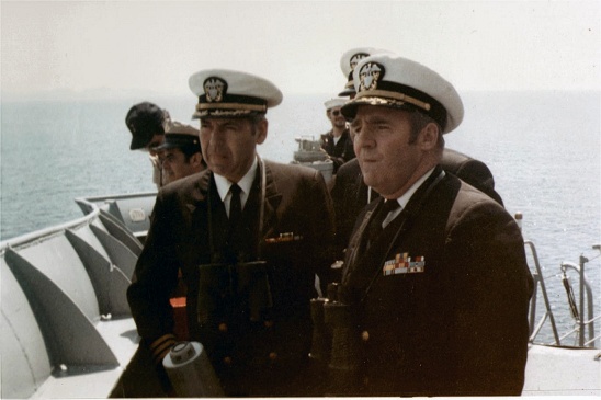 On inspection trip to Cam Ranh Bay last year, Vice Admiral Lawson P. Ramage, then commander of the military Sea Transportation Service, tells Margaret Draper how delighted he is with the facilities of the USS.