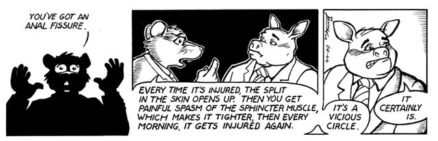Some strips have discussion fora attached, one of which was how I met above-mentioned beloved wife (who is still in the doghouse). Most forum participants enjoy discussing and speculating about each day’s strip and upcoming plot possibilities, as well as an entire universe of random topics that crop up; indeed, a forum can become a living community. But there’s a strange phenomenon that afflicts these virtual villages: some people take up residence for the express purpose of being critical of the subject matter. Like the poor degenerate I mentioned in this post, they plunk themselves down and blow raspberries at the strip and its creator, day after day, without end.